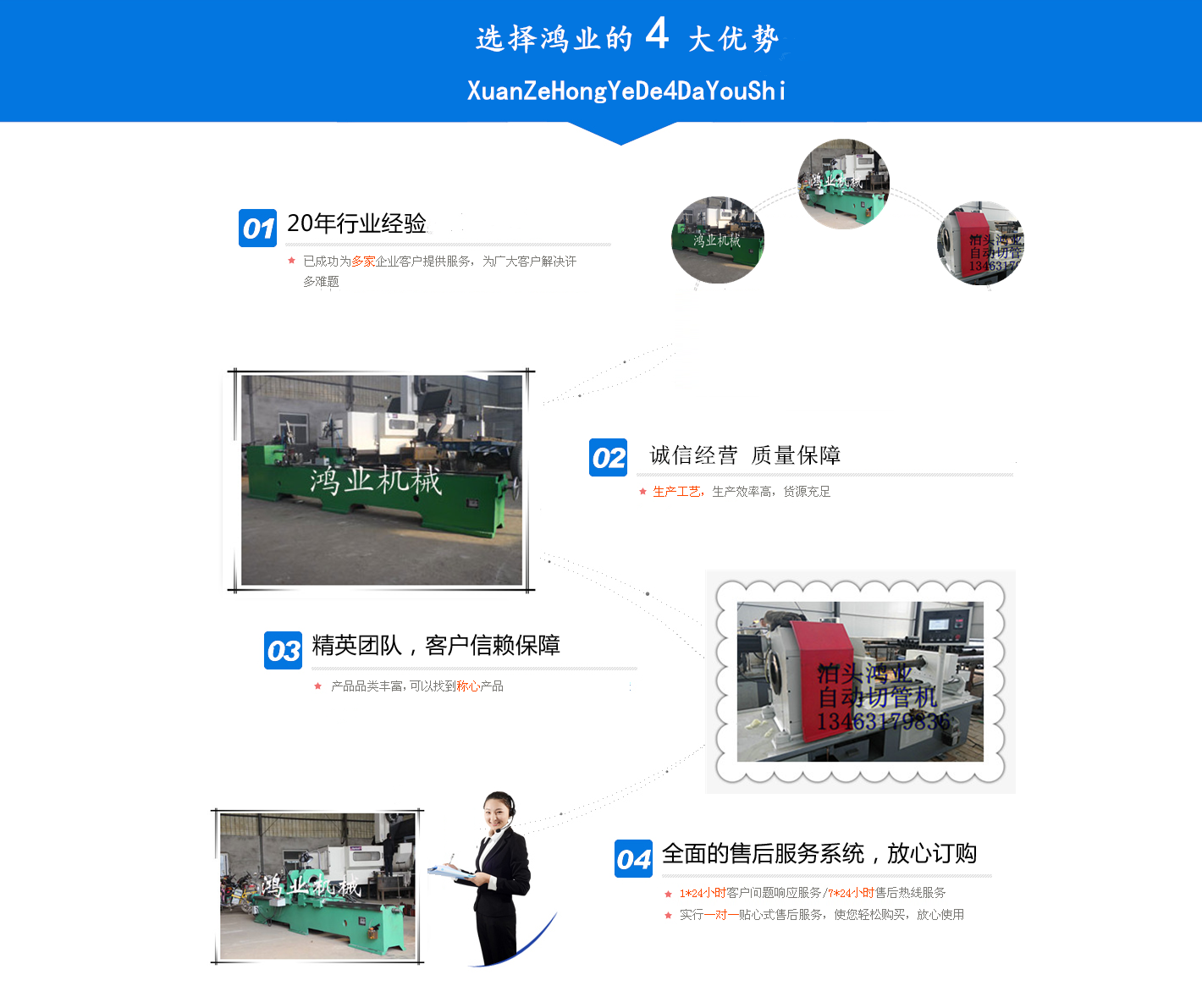 泊頭市鴻業機械金屬加工廠主要產品包括托輥雙端自動焊接機床,托輥雙端自動壓裝機床,鋼管自動倒角切斷機床,托輥鋼管雙端自動車孔機床,托輥鋼管雙頭車孔機床,托輥雙頭車,加工托輥專用設備.根據用戶對工件加工、焊接的不同工藝及工序要求,設計專用機床是公司的 點.本公司融合國內外生產技術,為廣大用戶提供科學性能優良,質量 的產品,我們擁有高素質的員工隊伍,隨時為您提供服務.
